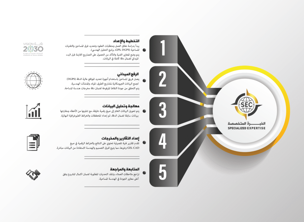 نفخر في شركة الخبرة المتخصصة في الهندسة المساحية والجيومكانية بتنفيذ مشاريع مساحية دقيقة تغطي القطاعات الحضرية، البحرية، والجبلية، وتخدم قطاعات البنية التحتية والطاقة والتخطيط العمراني.